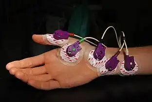A Eletromiografia é uma técnica de monitoramento da atividade elétrica das membranas excitáveis das células musculares esqueléticas, representando os potenciais de ação deflagrados por meio da leitura da tensão elétrica ao longo do tempo. A análise dos sinais gerados por estas atividades elétricas pode ser utilizada para detectar anormalidades, caracterizar níveis de ativação, ordem de recrutamento de fibras, ou para se estudar a biomecânica do movimento.[1] O sinal eletromiográfico (EMG) adquirido, ou eletromiograma, é o somatório algébrico de todos os sinais detectados sob a área de alcance dos eletrodos, podendo ser afetado por propriedades musculares, anatômicas e fisiológicas, assim como pelo controle do sistema nervoso periférico e pela própria instrumentação utilizada na aquisição dos sinais.[2] Existem duas formas principais de aquisição do sinal de EMG: aquisição de superfície e de profundidade. Cada uma destas formas de aquisição utilizam padrões específicos de eletrodos para detectar os sinais desejados.[3]
