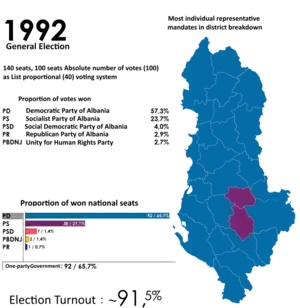 Diante do cenário de instabilidade social que caracterizou o período de transição do regime comunista unipartidário comandado pelo PPSh para uma democracia representativa pluripartidária na Albânia, a eleição parlamentar de 1991 acarretou um impasse político ocasionado pela elevada divisão demonstrada pelo eleitorado albanês: enquanto a população dos centros urbanos, minoria do eleitorado, votou em peso nos partidos de oposição (mais especificamente no recém-fundado PDSh, de centro-direita), a população das zonas rurais, maioria do eleitorado, ainda manteve fidelidade partidária ao PPSh, o que resultou na vitória dos comunistas por maioria absoluta.[1]