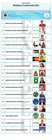 A eleição presidencial timorense de 2022 foi realizada em duas voltas, em 19 de março e 19 de abril.[1] Foi a 5ª eleição presidencial do país após a independência em 2002.