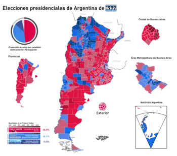 | Fernando de la Rúa | Carlos Chacho Álvarez | UCR | Coalização entre forças políticas de centro-direita a centro-esquerda | 9.167.220 | 48,37 / 100,00 | ||||||||