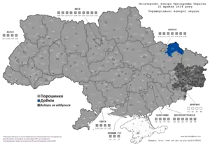 As eleições não foram realizadas em toda a Ucrânia. Durante a crise da Crimeia de 2014 , a Ucrânia perdeu o controle sobre a Crimeia , que foi anexada unilateralmente pela Rússia em março de 2014[4]. Como resultado, não foram realizadas eleições na Crimeia. Em Donbass, apenas 20% das urnas estavam abertas devido a ameaças e violência de separatistas pró-Rússia.[5]