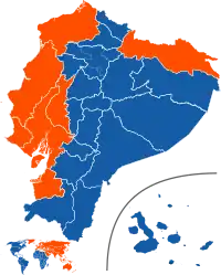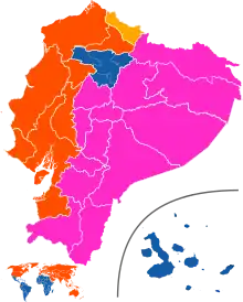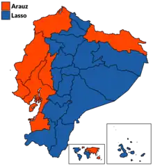 | Candidato mais votado no segundo turno por províncias e no exterior. Guillermo Lasso Andrés Arauz | ||||
