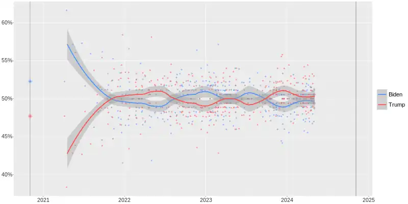 | RealClearPolitics | entre 23 de abril de 2024 | 29 de abril de 2024 | 39.4% | 40.3% | 10.4% | 2.0% | 1.5% | 6.4% | Trump +0.9 |