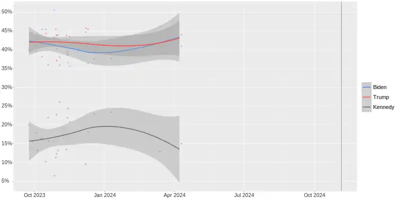 | Race to the WH | entre 22 de abril de 2024 | 30 de abril de 2024 | 45.4% | 45.9% | 8.7% | Trump +0.5 |