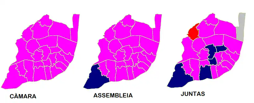 | 29 de setembro de 2013 | Autárquicas | 50,91 | 11 | 22,37 | 4 | 9,85 | 2 | 4,61 | 0 | 5,37 | 0 | 28,54 |