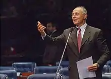 Professor da Fundação Getúlio Vargas, Eduardo Suplicy graduou-se em Administração de Empresas à referida instituição e possui Doutorado em Economia pela Michigan State University. Nascido em São Paulo, elegeu-se deputado estadual pelo MDB em 1978 e em 1980 ajudou à fundação do PT.[13] Eleito deputado federal em 1982, votou a favor da Emenda Dante de Oliveira em 1984 e ausentou-se da eleição presidencial indireta no Colégio Eleitoral em 1985 por orientação partidária.[14][15] Derrotado ao disputar a prefeitura de São Paulo em 1985 e o governo de São Paulo em 1986, foi eleito vereador na capital paulista em 1988, chegando a presidir a Câmara Municipal. Eleito senador em 1990, foi vencido por Paulo Maluf em segundo turno ao disputar a prefeitura paulistana em 1992, contudo assegurou outro mandato de senador em 1998.[16][nota 3]