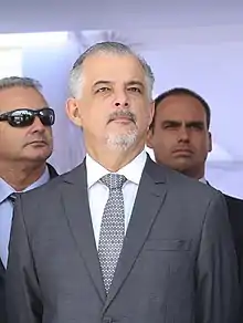 Vitorioso na eleição para governador, o médico Geraldo Alckmin tornou-se recordista ao conquistar três mandatos à frente do Palácio dos Bandeirantes dentre os seis triunfos consecutivos obtidos pelo PSDB no estado mais rico e populoso da federação.[nota 2] Nascido em Pindamonhangaba, graduou-se pela Universidade de Taubaté e chefiou o Departamento de Anestesiologia da Santa Casa de Misericórdia da cidade. Como membro do MDB, elegeu-se vereador em 1972 e prefeito de sua cidade natal em 1976. Após ingressar no PMDB elegeu-se deputado estadual em 1982 e deputado federal em 1986.[4] A segunda fase de sua carreira política tem início com a criação do PSDB e posterior subscrição da Constituição de 1988, fatos que garantiram sua reeleição em 1990.[5][6] Eleito e reeleito vice-governador na chapa de Mário Covas em 1994 e 1998, perdeu a eleição à prefeitura de São Paulo no ano 2000. Em 6 de março de 2001 a morte de Covas fez de Alckmin o novo governador, cargo para o qual seria reeleito em 2002. Derrotado por Luiz Inácio Lula da Silva no segundo turno da eleição presidencial de 2006, perdeu também a eleição para prefeito de São Paulo em 2008. Nomeado secretário de Desenvolvimento Econômico por José Serra no início do ano seguinte, foi eleito governador de São Paulo em 2010 e reeleito em 2014.[7][8][9][nota 3]