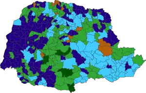Deputados federais eleitosEsses são os 30 deputados federais que irão representar o Estado do Paraná.[113] O ícone Assembleia LegislativaO resultado das últimas eleições estaduais e a situação atual da bancada da Assembleia Legislativa do Paraná está abaixo: