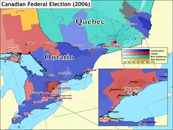 O Ontário tem sido tradicionalmente uma das bases do eleitorado do Partido Liberal canadense. Nesta eleição, os liberais obtiveram o apoio de uma pluralidade dos distritos legislativos do Ontário. Porém, perderam 21 posições na província, 17 para os conservadores e 4 para o NDP. 18 das 21 posições em disputa em Toronto - uma base primária do eleitorado liberal - foram vencidas pelos liberais, perdendo 2 posições para o NDP, que dominou um total de 3 na cidade. Jack Layton, líder do NDP, e único membro do NDP (e de qualquer outro partido político que não os liberais) a ser eleito em Toronto nas eleições de 2004, foi reeleito com facilidade.