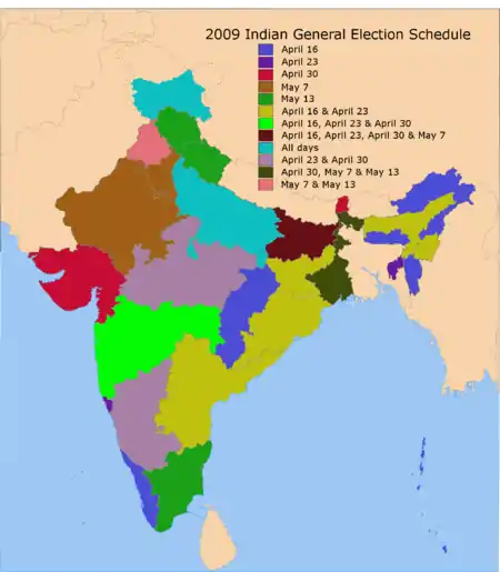 As eleições gerais indianas de 2009 foram realizadas em 5 turnos: em abril nos dias 16, 22, 23 e 30, e em maio nos dias 7 e 13.