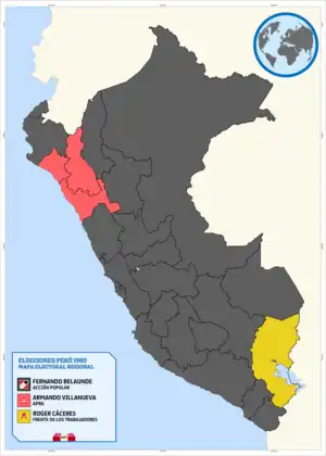 Na eleição presidencial, Fernando Belaúnde Terry, candidato pelo Ação Popular (AP) eleito presidente pela primeira vez nas eleições de 1963 e justamente o mandatário civil deposto por Alvarado em 1968, retornou à presidência do país após vencer por ampla margem de votos o candidato Armando Villanueva, um dos principais expoentes da Aliança Popular Revolucionária Americana (APRA) à época e mais treze candidaturas presidenciais. Belaúnde Terry venceu o pleito com maioria simples após conquistar 45,36% dos votos válidos contra 27,40% obtidos por Villanueva.[2]