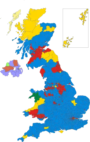| Mapa dos resultados por círculo eleitoral. Azul - Conservadores Vermelho - Trabalhistas Laranja - Aliança SDP–Liberal | |||||||||
