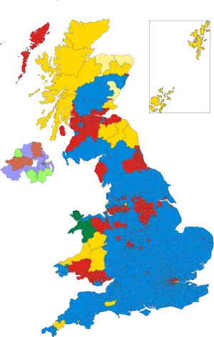 | Mapa dos resultados por círculo eleitoral. Azul - Conservadores Vermelho - Trabalhistas Laranja - Aliança SDP–Liberal | |||||||||
