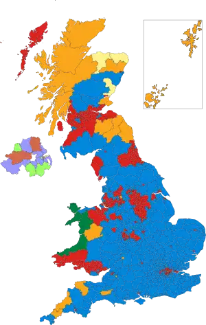| Mapa dos resultados por círculo eleitoral. Azul - Conservadores Vermelho - Trabalhistas Laranja - Liberal Democratas Amarelo - Nacionalistas Escoceses | |||||||||