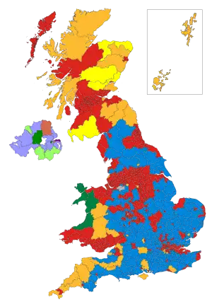 | Mapa dos resultados por círculo eleitoral. Vermelho - Trabalhistas Azul - Conservadores Laranja - Liberal Democratas | |||||||||