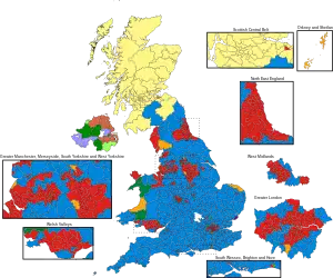 | Mapa dos resultados por círculo eleitoral. Azul - Conservadores Vermelho - Trabalhistas Laranja - Liberal Democratas Amarelo - Nacionalistas Escoceses | |||||||||