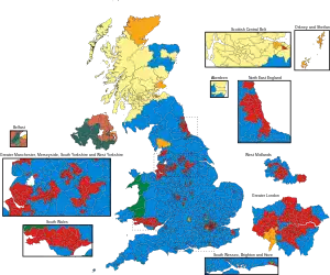 | Mapa dos distritos eleitorais do Reino Unido. Azul - Conservadores Vermelho - Trabalhistas Laranja - Liberal Democratas Amarelo - Nacionalistas Escoceses | |||||||||