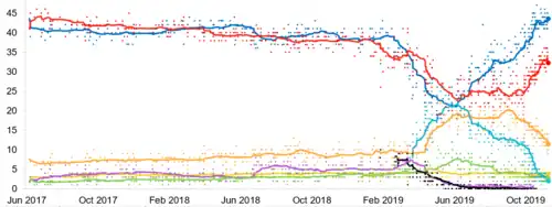 O gráfico abaixo mostra os resultados de pesquisas de opinião, em sua maioria apenas de eleitores na Grã-Bretanha, realizadas desde as eleições gerais de 2017 até a data da votação. A média móvel é calculada a partir das últimas 15 pesquisas.