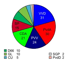 - O VVD recebeu 1.896.569 votos (20,4%), conquistando 31 assentos, nove a mais do que no pleito anterior de 2006.[3]