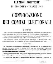 Em 28 dezembro de 2017, o presidente Sergio Mattarella dissolveu o Parlamento, convocando novas eleições para 4 de março de 2018.[33] O decreto assinado por Mattarella também estabeleceu em 23 de março a eleição dos presidentes da Câmara dos Deputados e do Senado.[34] Em seu tradicional discurso de final de ano, em 31 de dezembro, Mattarella pediu aos partidos que apresentassem propostas "realistas e concretas", bem como expressou seu desejo por uma alta participação dos eleitores.[35][36]