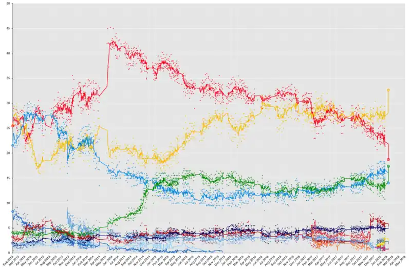 O gráfico abaixo revela os resultados das pesquisas eleitorais de intenções de votos realizadas de fevereiro de 2013 até fevereiro de 2018. De acordo com a legislação eleitoral da Itália, a publicação de pesquisas de opinião encontrava-se proibida nas últimas duas semanas da campanha eleitoral.[108]