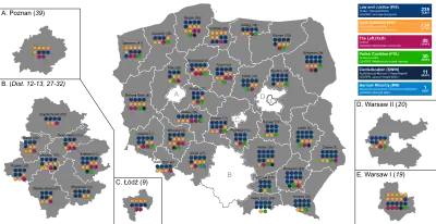 Todos os 460 assentos da Sejm 231 assentos necessários para maioria | ||||||||||||||||||||||||||||||||||||||||||||||||||