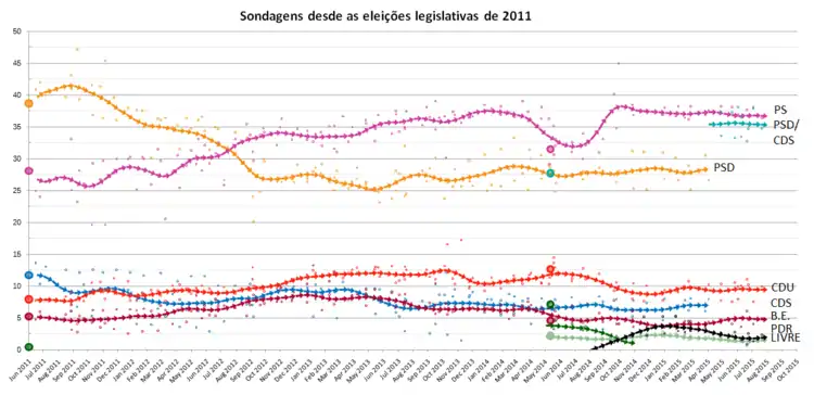 Quanto ao PS, liderado por António Costa desde 2014 após derrotar António José Seguro nas primárias socialistas, obteve um resultado inferior às suas intenções, tendo conseguido apenas 32,3% dos votos.[7][8] Os socialistas não conseguiram, como pretendiam, capitalizar o descontentamento de parte do eleitorado em relação ao governo PSD-CDS, devido a uma campanha considerada pouco entusiasmante, e a vários erros cometidos durante a mesma.[11]