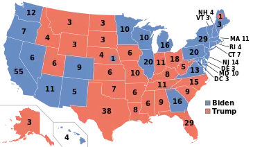 A disputa presidencial de 2020 será a 59ª eleição presidencial quadrienal dos Estados Unidos.[16] Trata-se de uma eleição indireta em que o candidato mais votado pelos eleitores em cada estado e no Distrito de Colúmbia ganha o número de votos que estes possuem no Colégio Eleitoral.[17] O candidato que alcançar a maioria dos votos no Colégio Eleitoral (270 de 538 votos) será considerado eleito, sendo empossado para um mandato compreendendo de 20 de janeiro de 2021 a 20 de janeiro de 2025.[18] Se ninguém alcançar tal maioria, a eleição será considerada contestada e a Câmara dos Representantes escolherá o próximo presidente e o Senado definirá o vice-presidente.[19]