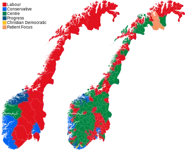 Na noite de 13 de setembro, a então primeira-ministra da Noruega, Erna Solberg, do Partido Conservador, reconheceu a derrota. Seu partido acabou com o segundo maior número de representantes.[5] O Partido Trabalhista de Jonas Gahr Støre manteve sua posição, como o maior partido da Noruega, apesar de uma pequena queda no número de votos em relação à última eleição em 2017. [6]