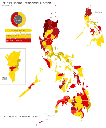 Por fim, os resultados eleitorais apontaram para uma diminuição significativa no comparecimento eleitoral, inferior à 79% do eleitorado filipino frente aos 89% observados na eleição presidencial de 1981. No entanto, o Movimento Nacional de Cidadãos por Eleições Livres (NAMFREL), organização não-governamental que atua até os dias atuais na fiscalização dos processos eleitorais no país de forma independente, apontou que houve um processo de descredenciamento eleitoral de cidadãos pertencentes à grupos sociais de oposição à ditadura, de modo que isso teria impactado diretamente na diminuição do eleitorado filipino apto ao voto em 1986.[14]