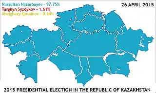 As eleições presidenciais cazaques de 2015 foram realizadas, de forma antecipada, em 26 de abril para eleger o presidente do Cazaquistão. Esta foi a quinta eleição presidencial realizada e a segunda sem ter nenhum candidato formal da oposição. Com a maior participação nacional de 95,2%, o resultado foi uma vitória para o presidente em exercício, Nursultan Nazarbayev do partido Nur-Otan, que recebeu 97,7% dos votos, a maior porcentagem desde 1991, conquistando assim um quinto mandato, enquanto seu desafiante mais próximo, Turgyn Syzdyqov, recebeu apenas 1,6% dos votos.[1]