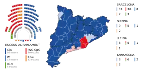 Quanto aos resultados eleitorais, o Partido dos Socialistas da Catalunha, pela primeira vez, tornou-se o partido mais votado da Catalunha, ao conquistar 37,9% dos votos.[1] Apesar disto, a Convergência e União continuou a ser o partido com mais deputados no parlamento regional, muito devido às vitórias da CiU nos círculos eleitorais mais pequenos.[2][3]