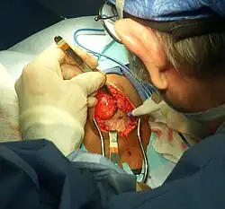 Eletrocirurgia é o procedimento cirúrgico que utiliza a passagem de corrente elétrica pelos tecidos, com finalidades curativas. Também é chamada de cirurgia por radiofrequência.[1] Consiste na aplicação de uma corrente elétrica alternada de alta frequência (radiofrequência) a um tecido biológico como um meio de cortar, coagular, dessecar ou fulgurar o tecido. [2] [3] [4] [5] [6] [7] [8] Seus benefícios incluem a capacidade de fazer cortes precisos com perda limitada de sangue. Dispositivos eletrocirúrgicos são frequentemente usados durante operações cirúrgicas, ajudando a prevenir a perda de sangue em salas de cirurgia de hospitais ou em procedimentos ambulatoriais. [9]