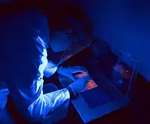 Quando corado com brometo de etídio, o gel é visualizado com um transiluminador ultravioleta (UV). A luz UV excita os elétrons dentro do anel aromático do brometo de etídio e, quando eles retornam ao estado fundamental, a luz é liberada, fazendo com que o complexo de DNA e brometo de etídio fique fluorescente.[12] Os transiluminadores padrão usam comprimentos de onda de 302/312 nm (UV-B), mas a exposição do DNA à radiação UV por apenas 45 segundos pode causar danos ao DNA e afetar os procedimentos subsequentes, por exemplo, reduzindo a eficiência da transformação, da transcrição in vitro e da PCR.[30] Portanto, a exposição do DNA à radiação UV deve ser limitada. O uso de um comprimento de onda maior, de 365 nm (faixa UV-A), causa menos danos ao DNA, mas também produz uma fluorescência muito mais fraca com o brometo de etídio. Quando vários comprimentos de onda podem ser selecionados no transiluminador, o comprimento de onda mais curto pode ser usado para capturar imagens, enquanto o comprimento de onda mais longo deve ser usado se for necessário trabalhar no gel por um período de tempo prolongado.