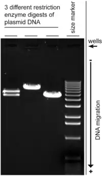 As moléculas menores se deslocam mais rapidamente do que as moléculas maiores no gel, e o DNA de fita dupla se desloca a uma taxa que é inversamente proporcional ao logaritmo do número de pares de bases. No entanto, essa relação se rompe com fragmentos de DNA muito grandes, e a separação de fragmentos de DNA muito grandes requer o uso de eletroforese em gel de campo pulsado (PFGE), que aplica corrente alternada de diferentes direções e os fragmentos grandes de DNA são separados à medida que se reorientam com a mudança de campo.[12]
