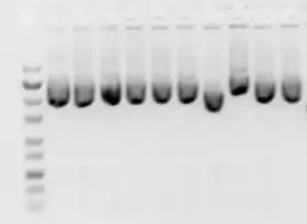 - Estimativa da concentração de DNA comparando a intensidade da banda de ácido nucleico com a banda correspondente do marcador de tamanho.[34]