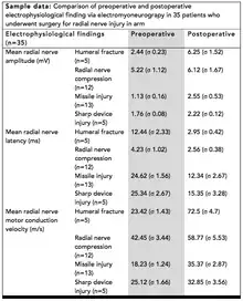 A eletroneuromiografia também pode ser usada para medir a recuperação do paciente a partir de procedimentos cirúrgicos, como o reparo do nervo. Um estudo realizado em pacientes com lesões do nervo proximal usou o procedimento para indicar o grau de lesão nervosa pré e pós-operatória.[8] Neste estudo particular, a eletroneuromiografia foi o método preferido de medição da recuperação, escolhido em imagens de ressonância magnética (MRI) e tomografia computadorizada (TC). Ao olhar para a tabela de dados da amostra, pode-se ver que os pacientes pós-operatórios geralmente vêem um aumento na amplitude média do nervo radial, uma diminuição da latência do nervo radial médio e aumentos na velocidade de condução do motor nervoso. Esses resultados são todas tendências gerais que seriam esperadas quando operavam em nervos danificados no esforço para aumentar seu desempenho.