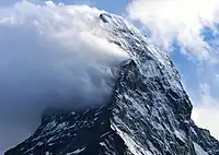 - Quando há um vento forte, uma nuvem de estandarte é formada a favor do vento nas encostas superiores de montanhas isoladas e íngremes. É criado pelas áreas de baixa pressão nos vórtices a favor do vento que se desenham no ar relativamente úmido das encostas mais baixas da montanha. Esta redução na pressão em comparação com o ar circundante aumenta a condensação, da mesma maneira que os vórtices de ponta de asa de uma aeronave. A nuvem mais famosa forma-se rotineiramente a sotavento do Matterhorn.