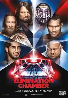 ![]() Pôster promocional do evento apresentando Mustafa Ali, Daniel Bryan, AJ Styles, Jeff Hardy, Randy Orton, Samoa Joe, e o Elimination Chamber | |||