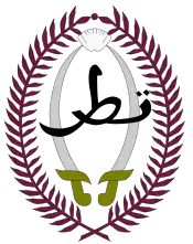 O Emblema nacional do Catar tem como símbolo principal duas cimitarras perfuradas pelo cabo dentro de um círculo amarelo, entre as quais há um navio do tipo dahu navegando em um mar de ondas azuis e árvores perto de uma ilha com duas palmeiras. Limitando o círculo central está uma borda dividida horizontalmente por uma linha recortada. O escudo está rodeado pelas cores da bandeira nacional.[1] Na parte superior, em branco, está o nome oficial do estado escrito em árabe: دولة قطر (Dawlat Qatar, Estado do Qatar), em caracteres cúficos marrons, enquanto a parte inferior, em marrom, às vezes contém também este mesmo oficial nome escrito em inglês (Estado do Qatar) em letras brancas. Foi adaptado oficialmente em 1976.[2]