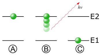 Se uma fonte de luz (um átomo, por exemplo) está em um estado excitado com a energia , pode decair espontaneamente (sem nenhuma ajuda externa) para o estado fundamental, de energia , liberando a diferença de energia entre os dois estados, na forma de um fóton. O fóton terá frequência e energia , dado pela equação de Planck:, onde é a constante de Planck. Um diagrama de níveis de energia, que ilustram o processo pode ser visto na figura ao lado.[3][4]