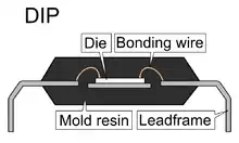 A embalagem comercial do circuito foi trocado rapidamente pela dual in-line package (DIP), sendo a primeira em cerâmica e posteriormente em plástico.[5] Na década de 1980, a contagem de pinos excedeu o limite prático para embalagem DIP, levando aos encapsulamentos pin grid array (PGA) e leadless chip carrier (LCC).[6] O encapsulamento Surface mount apareceu no início de 1980 e tornou-se popular no final da década, usando uma sonda melhor com ligações formadas por gull-wing ou J-lead, como exemplificado por small-outline integrated circuit - um transportador, que ocupa uma área de cerca de 30 - 50% a menos do que um equivalente DIP , com uma espessura típica que é 70% menos.[6]