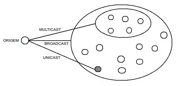 Existem, basicamente, três formas de endereçamento que podem ser implementadas em uma rede: unicast, multicast e broadcast (imagem abaixo). No endereçamento unicast, a origem envia uma mensagem para apenas um destinatário, ou seja, apenas um dispositivo receberá a mensagem. No endereçamento broadcast, a origem envia uma mensagem para todos os dispositivos da rede. No endereçamento multicast, a origem envia uma mensagem para um grupo de dispositivos chamado grupo multicast. O grupo multicast é um subconjunto dos dispositivos que formam a rede.[3]