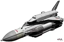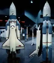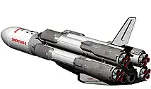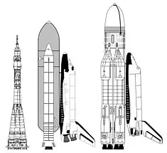 ![]() Comparações: foguete da Soyuz (esquerda), Ônibus espacial americano (centro) e Energia (direita). |