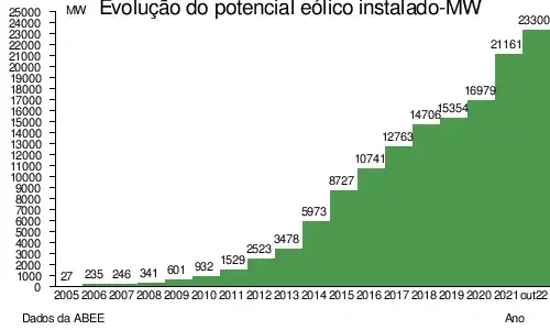 A energia eólica no Brasil[2] tinha capacidade instalada de 23,3 GW em outubro de 2022 (maior do que a da Usina de Itaipu, que tem 14 GW instalados).[3]