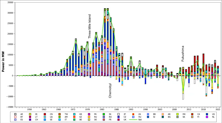 A China tem o programa de energia nuclear que mais cresce com 28 novos reatores em construção,[4] e um número considerável de novos reatores também estão sendo construídos na Índia, Rússia e na Coreia do Sul. Ao mesmo tempo, pelo menos 100 reatores mais velhos e menores irão "muito provavelmente, serem fechados nos próximos 10 a 15 anos".[5]