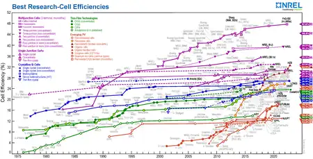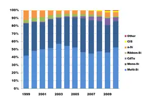Em termos das próprias células, só tem tido uma mudança importante. Durante a década de 1990, as células de polisilício fizeram-se a cada vez mais populares.[58] Estas células oferecem menos eficiência que aquelas de monosilício, mas se cultivam em grandes cubas que reduzem em grande parte o custo de produção.[58] Em meados da década de 2000, o polisilício dominava no mercado de painéis de baixo custo.[58]