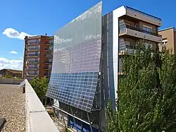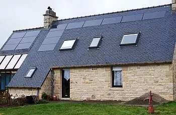 Muitas instalações fotovoltaicas encontram-se com frequência situadas nos edifícios: normalmente situam-se sobre um telhado já existente, ou bem se integram em elementos da própria estrutura do edifício, como entra luzes, claraboias ou fachadas.[102]