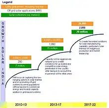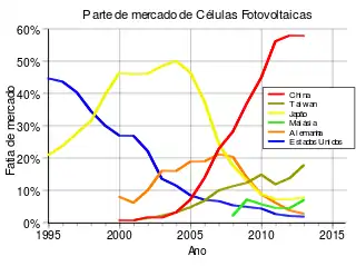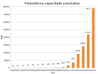 Este tipo de energia usa-se para alimentar uma grande variedade de aplicativos e aparelhos autónomos, para abastecer refúgios ou moradias isoladas da rede elétrica e para produzir eletricidade a grande escala através de redes de distribuição. Devido à crescente demanda de energias renováveis, a fabricação de células solares e instalações fotovoltaicas tem avançado consideravelmente nos últimos anos.[2][3] Entre os anos 2001 e 2015 produziu-se um crescimento exponencial da produção de energia fotovoltaica, dobrando-se aproximadamente a cada dois anos.[4] A potência total fotovoltaica instalada no mundo (conectada à rede) ascendia a 16 GWp em 2008, 40 GWp em 2010, 100 GWp em 2012 e 140 GWp em 2013.[5][6][7][8] No final de 2014, tinham-se instalado em todo mundo cerca de 180 GWp de potência fotovoltaica.[9]