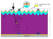 - A capa inferior da célula, que se compõe de silício dopado de tipo p.[notas 4]Esta capa tem portanto uma quantidade média de elétrons livres menor que uma capa de silício puro. Os elétrons estão unidos à rede cristalina que, em consequência, é eletricamente neutra mas apresenta lacunas, positivas (p). A condução elétrica está assegurada por estes portadores de carga, que se deslocam por todo o material.